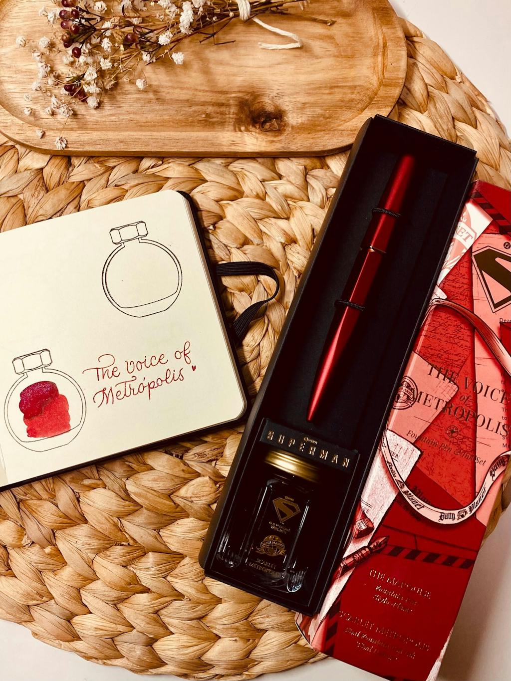Confident and expressive, the Voice of Metropolis set stands out with a striking scarlet Superman Edition Marquise Fountain Pen. Complimented by the Scarlet Metropolis 28ml Ink – a bold, luminous red with blue shimmer created to make a statement.